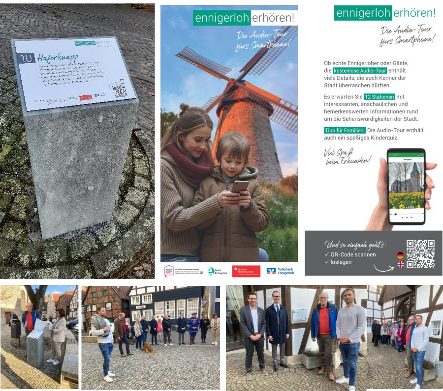 Mein herzlicher Dank gilt allen Beteiligten! Denen, die die Finanzierung gesichert haben. Den Firmen Soundgarden und Senger, mit denen wir sehr gut zusammengearbeitet haben. Insbesondere aber den vielen Beteiligten in der Kooperation für die sehr gute, kollegiale Zusammenarbeit und den zahlreichen Menschen darüber hinaus, die uns ganz einfach unterstützt haben, wenn wir Hilfe benötigten und sie angesprochen haben. Ich denke, die Audioguidetour Ennigerloh erhören! ist wunderbar geworden und eine echte Bereicherung für Ennigerloh!Doch nun endlich zur Praxis: Ich lade Sie / euch ein zu einem kleinen Einstiegsgang in die Audioguidetour Ennigerloh erhören! von der Station 1 Kirchplatz bis zur Station 4 Hubertusdenkmal.Zugang zur Tour über die App mittels QR-Code vom Stationsschild! App aktualisieren/herunterladen durch Klick auf die Wolke (cloud) oben rechts, am besten offline speichern (dann ist nicht immer Internet erforderlich) und los geht’s. Tour auswählen: Auswahl Audioguide deutsch oder englisch, dann mit Station 1 starten.