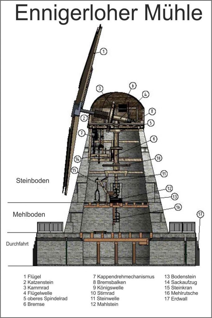 Um die Kappe mit den Flügeln in den Wind zu drehen (oder heraus) musste der Mülle die Mühle nicht verlassen, denn die Ennigerloher Windmühle ist ein Binnendreher. Dieses modernere System gibt es im lippisch-westfälischen Raum nur bei drei Mühlen.