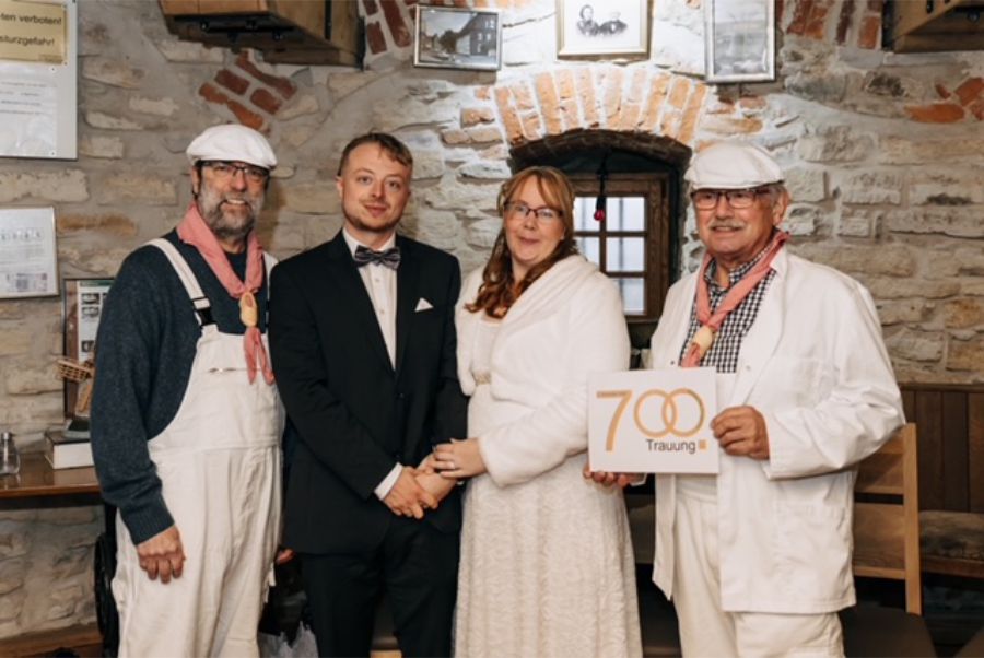 Für die Frischvermählten ein ganz besonderer Moment. Doch nicht nur für sie war diese Trauung etwas Besonderes: Wie es der Zufall so wollte, waren sie das 700. Paar seit Juni 2010, welches sich in der Windmühle trauen ließ. Daher gratulierten die ehrenamtlichen „Müller“ Klaus Schmitt und Rainer Silz im Namen der Mühlenfreunde ganz herzlich und Überreichten Ihnen eine „Merschkämper Brotbackmischung“. Heiraten in der wundervollen Atmosphäre der Ennigerloher Windmühle, das hat eben etwas!